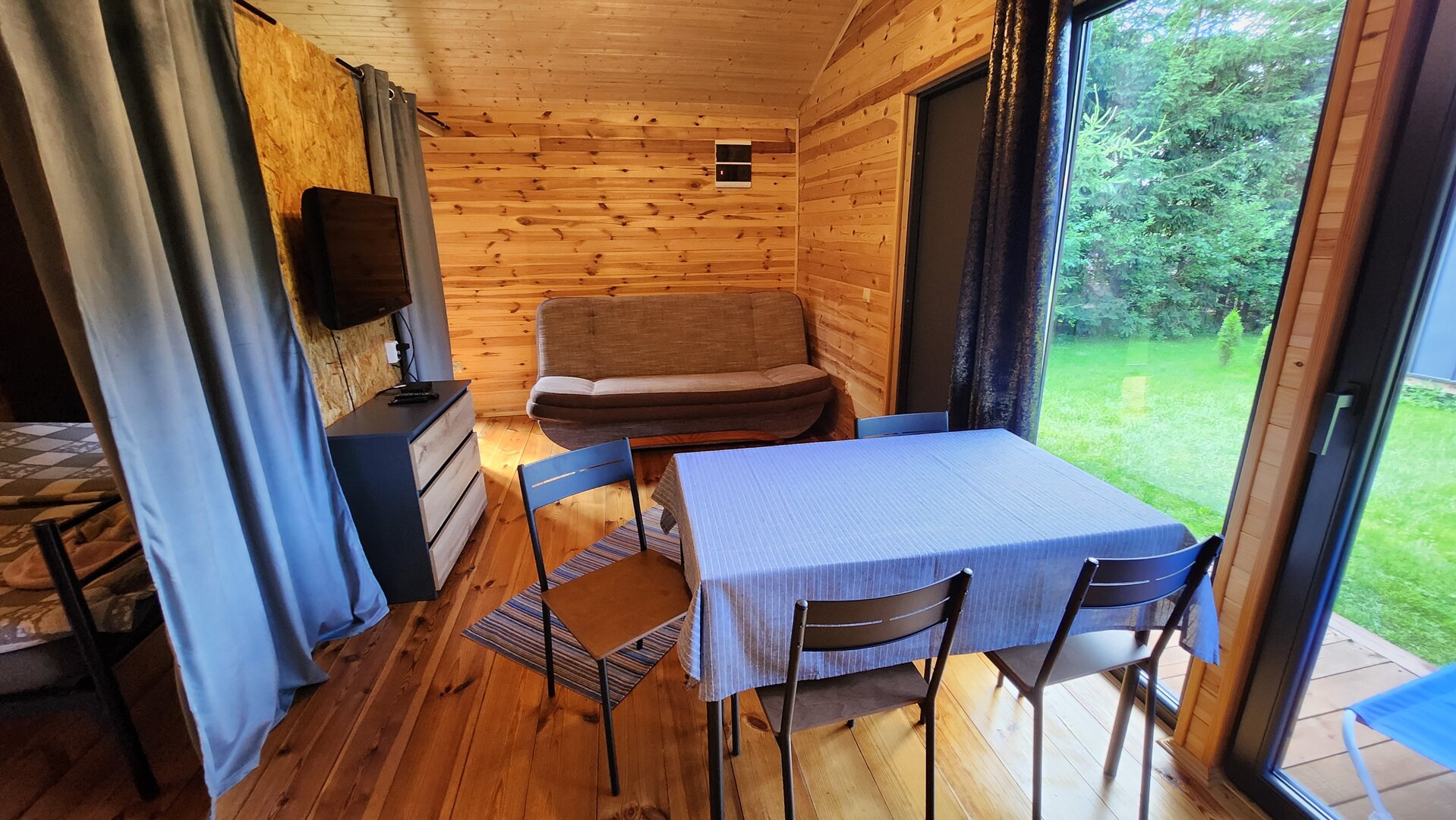 Domek czteroosobowy z łazienką, aneksem kuchennym , wydzieloną częścią sypialną i tarasem.