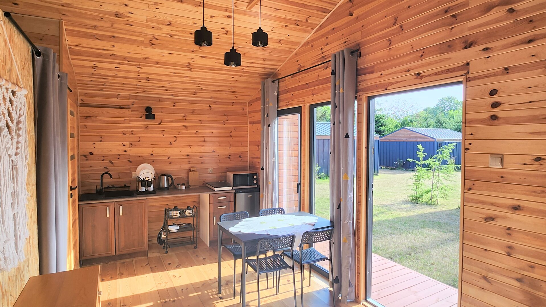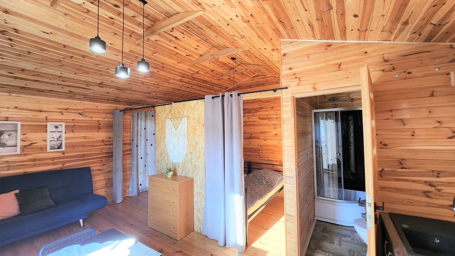 Domek wyposażony jest w 4 miejsca noclegowe. Dwa łóżka pojedyncze znajdują sie w części sypialnej, natomiast w części dziennej stoi rokładana, dwuosobowa kanapa. Pomieszczenia oddzielone są od siebie ścianką i zasłonami. Z każdego z nich można wyjść na zewnątrz. Poza tym na wyposażeniu domku znajdują się: stół z krzesłami, szafa, komoda, telewizor, lustro, ręczniki. Aneks kuchenny posiada  niezbędne naczynia i akcesoria. Łazienka wyposażona została w wc, umywalkę i kabinę natryskową.