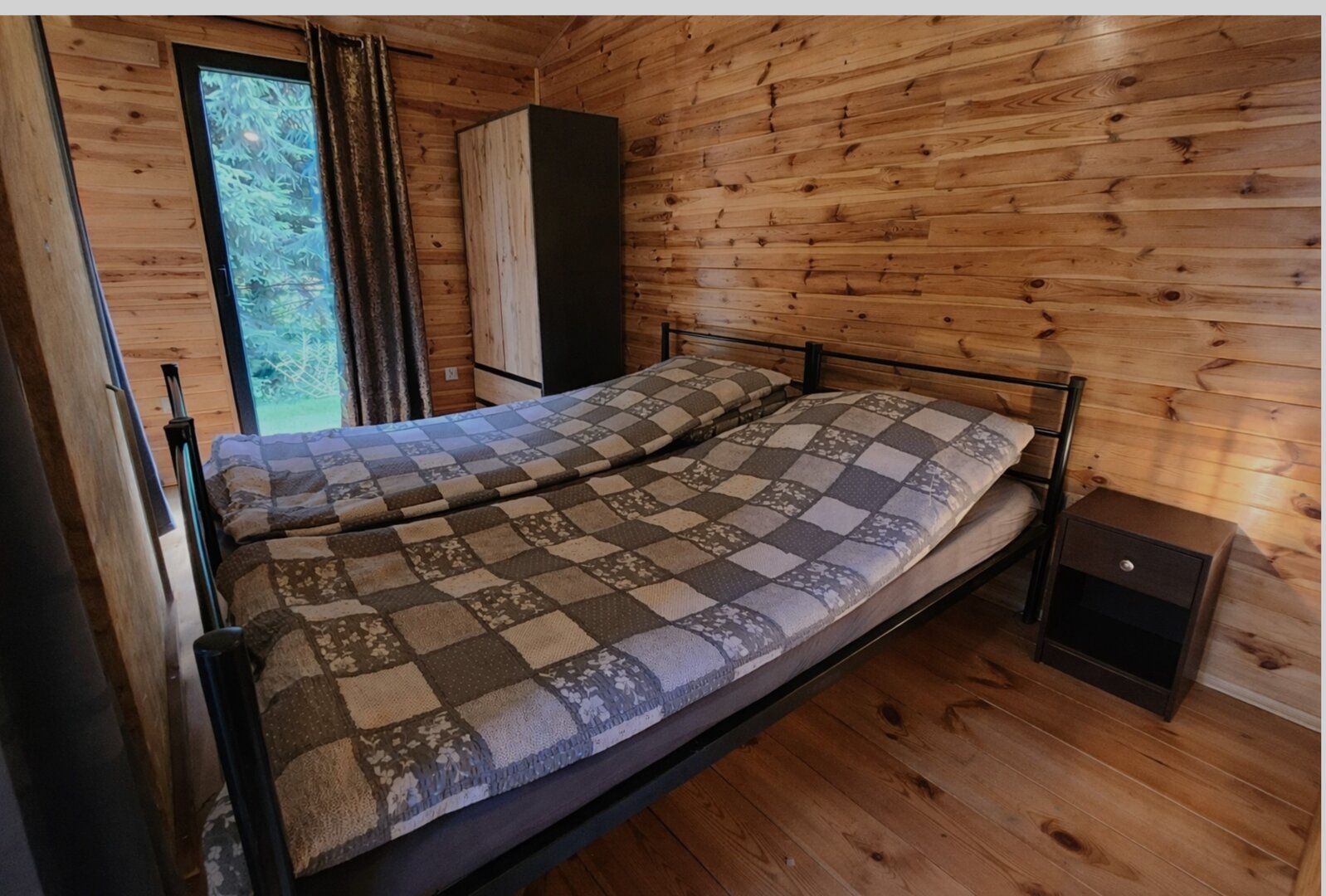 Domek wyposażony jest w 4 miejsca noclegowe. Dwa łóżka pojedyncze znajdują sie w części sypialnej, natomiast w części dziennej stoi rokładana, dwuosobowa kanapa. Pomieszczenia oddzielone są od siebie ścianką i zasłonami. Z każdego z nich można wyjść na zewnątrz. Poza tym na wyposażeniu domku znajdują się: stół z krzesłami, szafa, komoda, telewizor, lustro, ręczniki. Aneks kuchenny posiada  niezbędne naczynia i akcesoria. Łazienka wyposażona została w wc, umywalkę i kabinę natryskową.